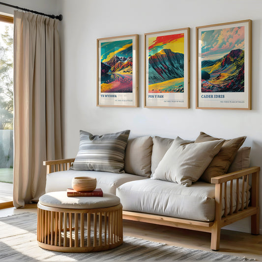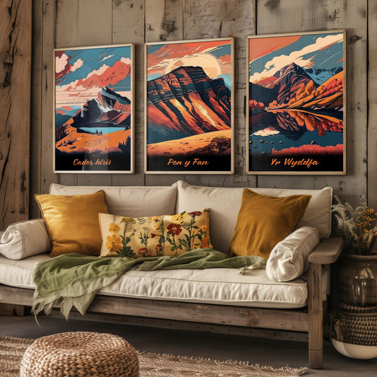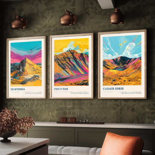 Set of Three Peaks of Wales Travel Posters V2 - Cader Idris, Pen y Fan, Yr Wyddfa- 3 Art Prints
