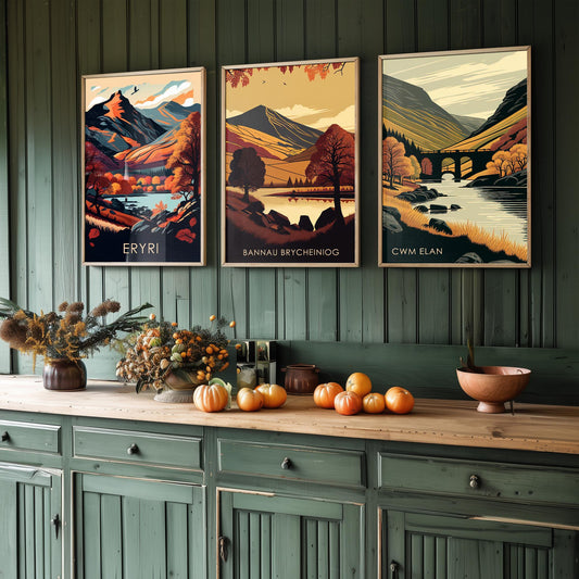Set of Three Welsh Locations in Autumn Travel Posters (Welsh Names) - Set of 3 Bannau Brycheiniog, Cwm Elan, Eryri Vector Paintings Wall Art