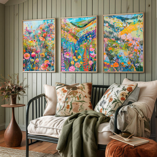 Fields and Flower Meadows in Pastel Collage - Set of Three Art Print Poster - 3 Painting Illustrations Wildlife Wildflower Décor Summer