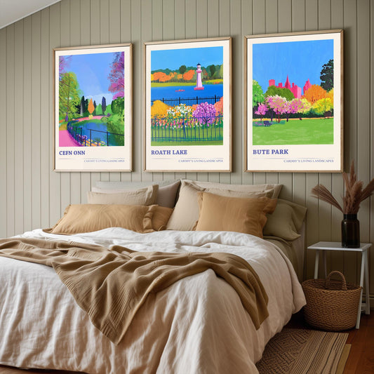 Cardiff's Living Landscapes - Set of Three Art Prints - Cefn Onn, Roath Lake, Bute Park Posters - 3 Photo Painting Illustration Gift Wales
