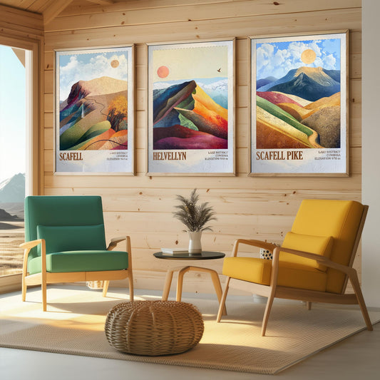 The Three Peaks of England Art Prints - Scafell, Helvellyn & Scafell Pike Posters - 3 Mountain Paintings - Photo Illustration Gift Mount