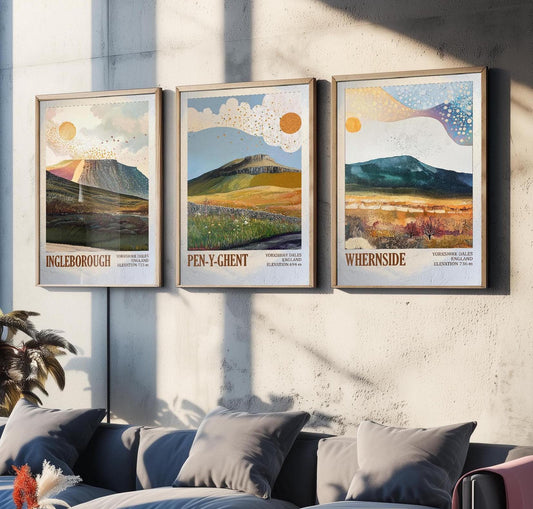 The Yorkshire Three Peaks Challenge - Set of Three Art Print Posters - Ingleborough, Pen-y-Ghent and Whernside - 3 Layers of Foil V2