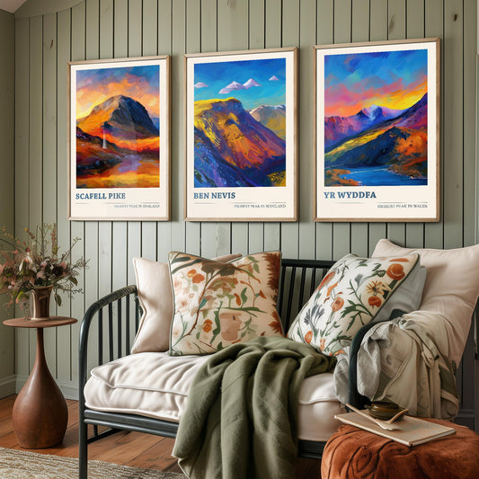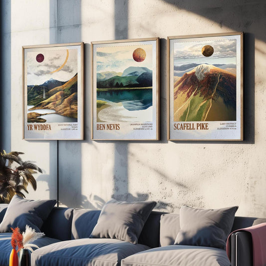The Three Peaks of The UK - Scafell Pike, Ben Nevis and Yr Wyddfa - Set of 3 Prints - Mountain Travel Posters
