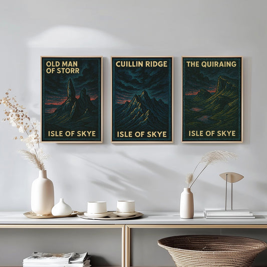 Isle of Skye Set of Three Art Prints- Old Man of Storr, Cuillin Ridge, The Quiraing Posters - 3 Dark Moody Illustration Painting Highlands