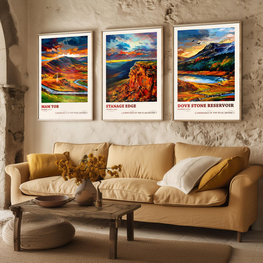 Landmarks of the Peak District - Set of Three Art Prints - Mam Tor, Stanage Edge, Dove Stone Reservoir Posters