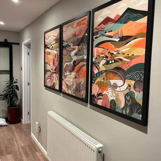 Landscape Illustrations in Dark Rainbow - Set of Three Abstract Prints - Cumbria Lake District Poster, Wales Art, Painting Elan Valley