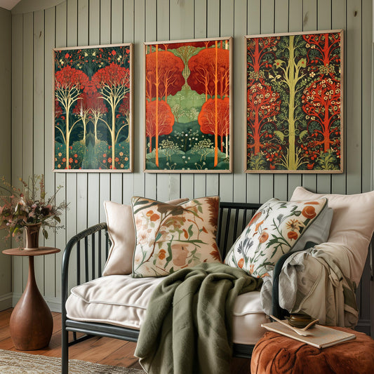 Scottish Book of the Woodlands #1 - Yellow / Red - Set of Three Paintings - 3 Forest Art Prints Poster
