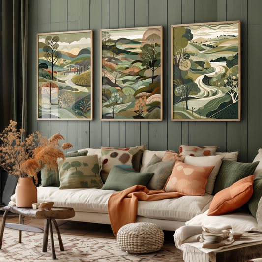 Landscape Illustrations in Olive Green - Set of Three Abstract Art Prints - South Downs Poster