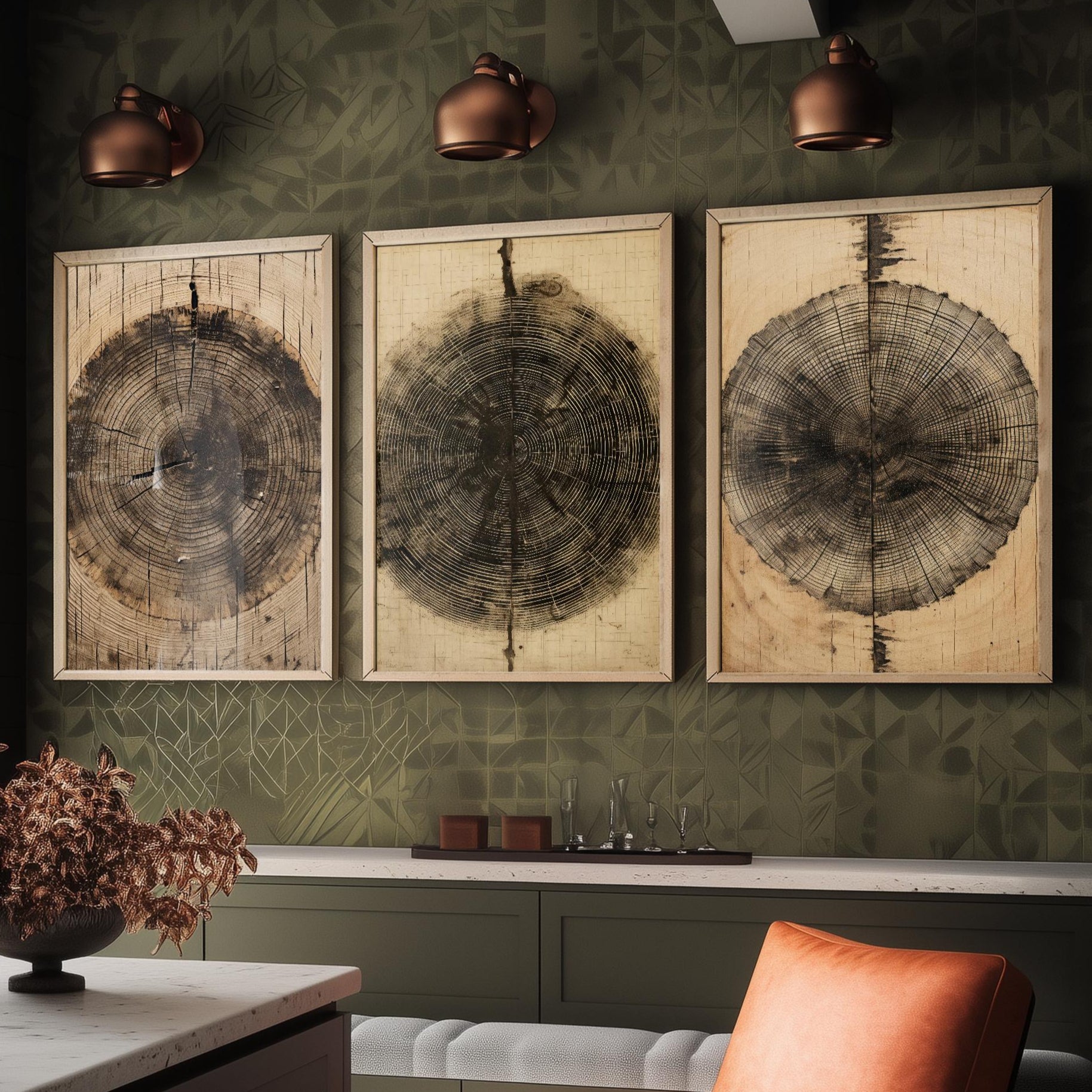 Set of Three Tree Ring Stump Paintings - 3 Natural Pattern Art Prints - Photo Poster Wall Gift Giclée Décor, Organic Wood Wooden Aged